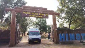 पन्ना टाइगर रिजर्व में बाघ के हमले में मृत महिला के शव को लेकर हिनौता गेट से बाहर निकलता एम्बुलेंस वाहन। (फाइल फोटो)