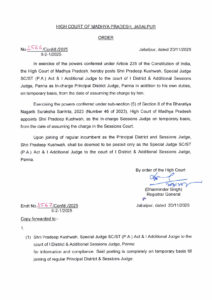 मध्य प्रदेश उच्च न्यायालय, जबलपुर के रजिस्ट्रार जनरल द्वारा आज गुरुवार 20 नवम्बर को एक आदेश जारी कर पन्ना के विशेष न्यायाधीश प्रदीप कुशवाहा को अपने कर्तव्यों के अतिरिक्त प्रभारी प्रधान एवं जिला न्यायाधीश, पन्ना के रूप में अस्थाई तौर पर नियुक्त किया गया है।
