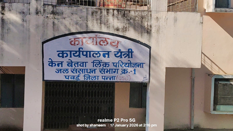 पन्ना जिले के पवई क़स्बा में स्थित केन-बेतवा लिंक परियोजना जल संसाधन संभाग क्र.-1 का कार्यालय।