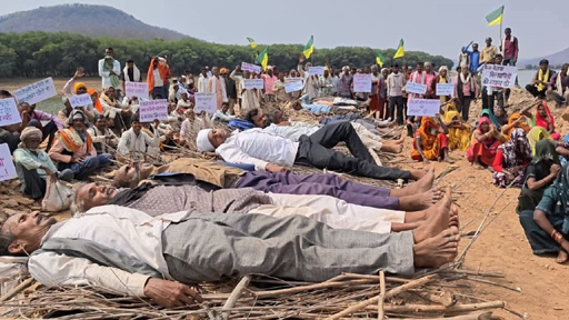 केन-बेतवा लिंक परियोजना प्रभावित आदिवासी और ग्रामीणों का ढोड़न बांध स्थल पर केन नदी में अपनी चिता पर लेटकर आंदोलन-प्रदर्शन आठवें दिन भी जारी रहा।
