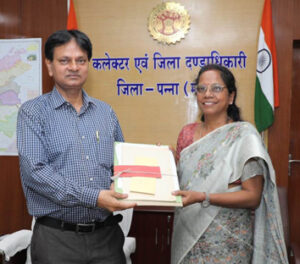 पन्ना। नवागत कलेक्टर ऊषा परमार ने शुक्रवार 3 अक्टूबर को सुबह कलेक्टर कार्यालय पहुंचकर पन्ना कलेक्टर का पदभार ग्रहण किया। निवर्तमान कलेक्टर एवं चंबल संभागायुक्त बनाए गए सुरेश कुमार ने नवागत जिला कलेक्टर को पदभार ग्रहण कराया और कार्यभार सौंपा। इस मौके पर पुलिस अधीक्षक निवेदिता नायडू, डीएफओ गर्वित गंगवार एवं अनुपम शर्मा, जिला पंचायत सीईओ उमराव सिंह मरावी, एसडीएम संजय कुमार नागवंशी, तहसीलदार अखिलेश प्रजापति सहित अन्य अधिकारीगण उपस्थित रहे। नवागत कलेक्टर श्रीमती परमार का अधिकारियों द्वारा पुष्पगुच्छ भेंट कर आत्मीय स्वागत किया गया एवं कलेक्टर पद पर पहली पदस्थापना पर बधाई एवं शुभकामनाएं भी दी गईं।